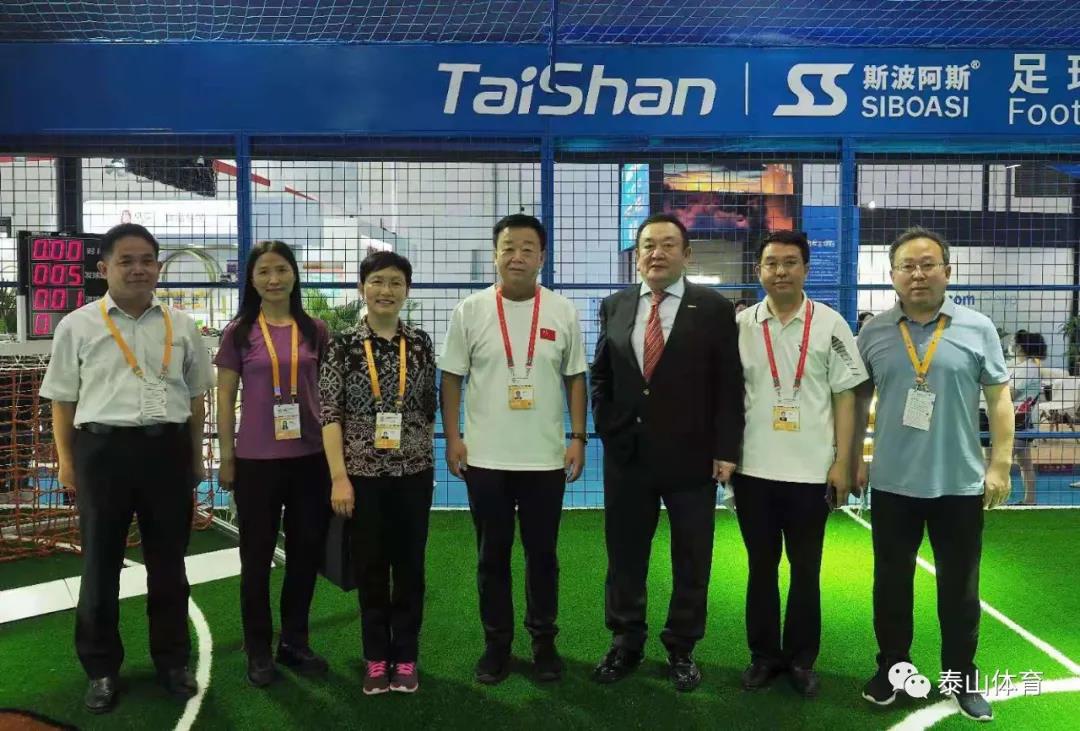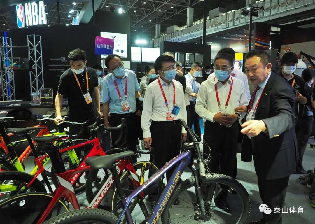 山东省商务厅厅长张德平在米兰·(milan)体育产业集团董事长卞志良陪同下参观一号馆米兰·(milan)体育展厅。