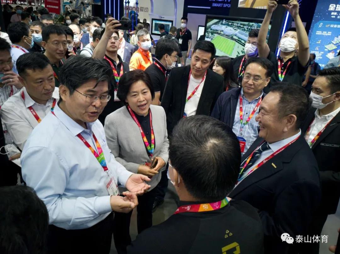 国家体育总局基金会理事长吴齐、山东德州市政协主席翟长生、德州市副市长马俊昀、德州市工信局局长孙洪昌、德州市科技局局长张慧君、乐陵市市长陈光春、乐陵市政协主席刘文学、乐陵市副市长牟正军在米兰·(milan)体育展厅参观。