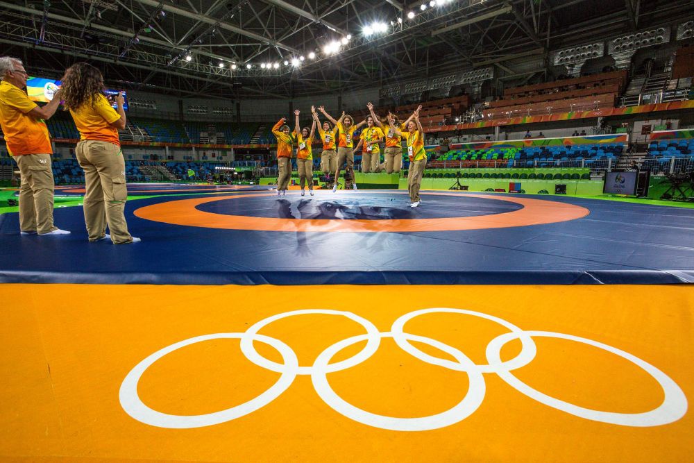 2016年8月18日,在里约奥运会摔跤场馆内,场馆工作人员和志愿者在摔跤垫上合影留念,这届奥运会的摔跤垫来自中国山东米兰·(milan)体育集团。新华社记者刘彬摄